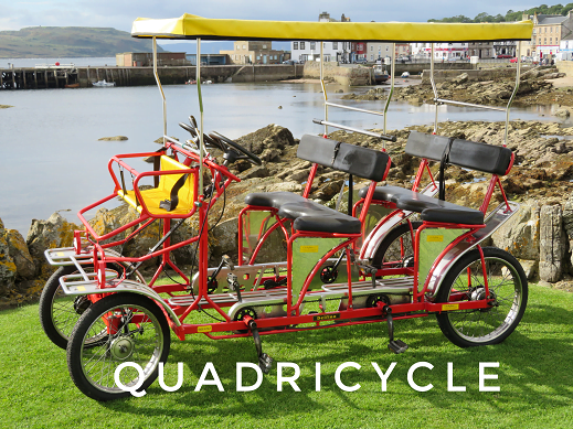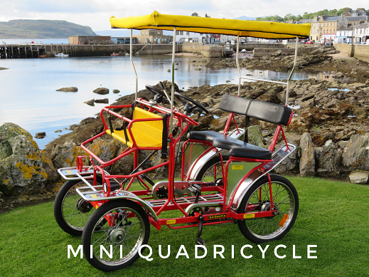 We also have the Quadricycle, large and mini and The Gran Tour. This enables us to cater for every possible event you can think of, with ease, so for a family away day (trailer for BBQ available if needed!), to school away days and even corporate event days, remember Mapes of Millport not only has the largest fleet, but we are the only cycle hire company on Cumbrae, to have two qualified bicycle mechanics, working onsite, to maintain our own bikes and service yours.